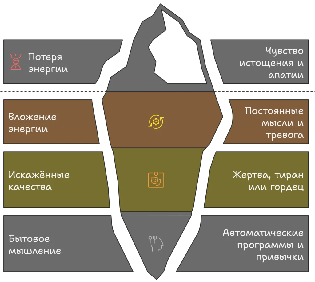 - Формируем в вас искажённые представления и качества характера. Вы тратите энергию на поддержание иллюзий и проживаете "чужую" жизнь;